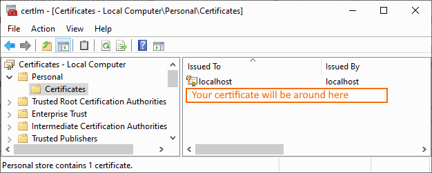 You need to export the certificate. And to start the process, find “Manage Computer Certificates” in windows control panel. Find your certificate in Personal section: